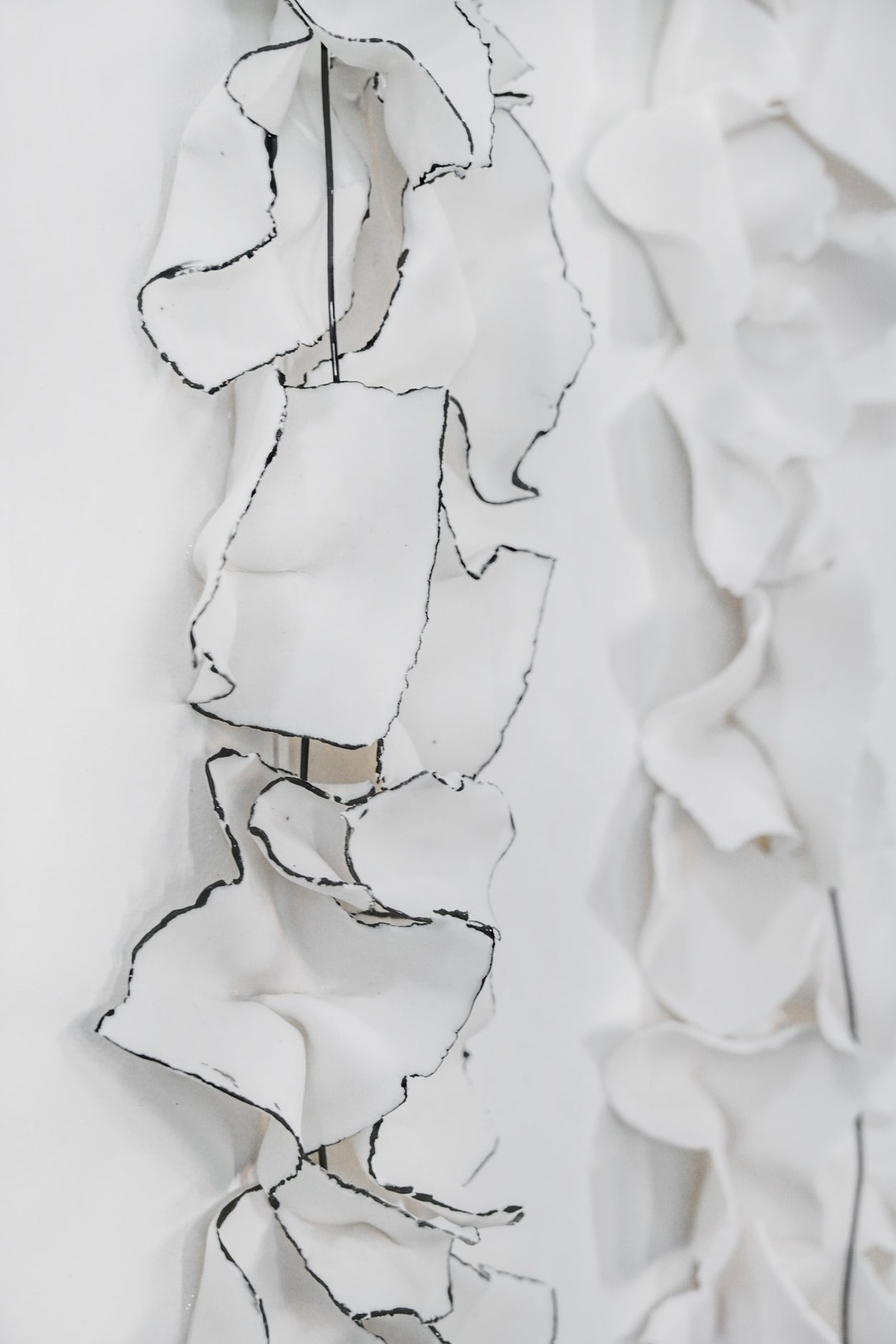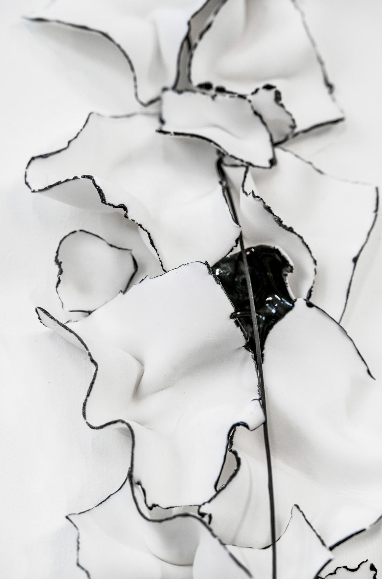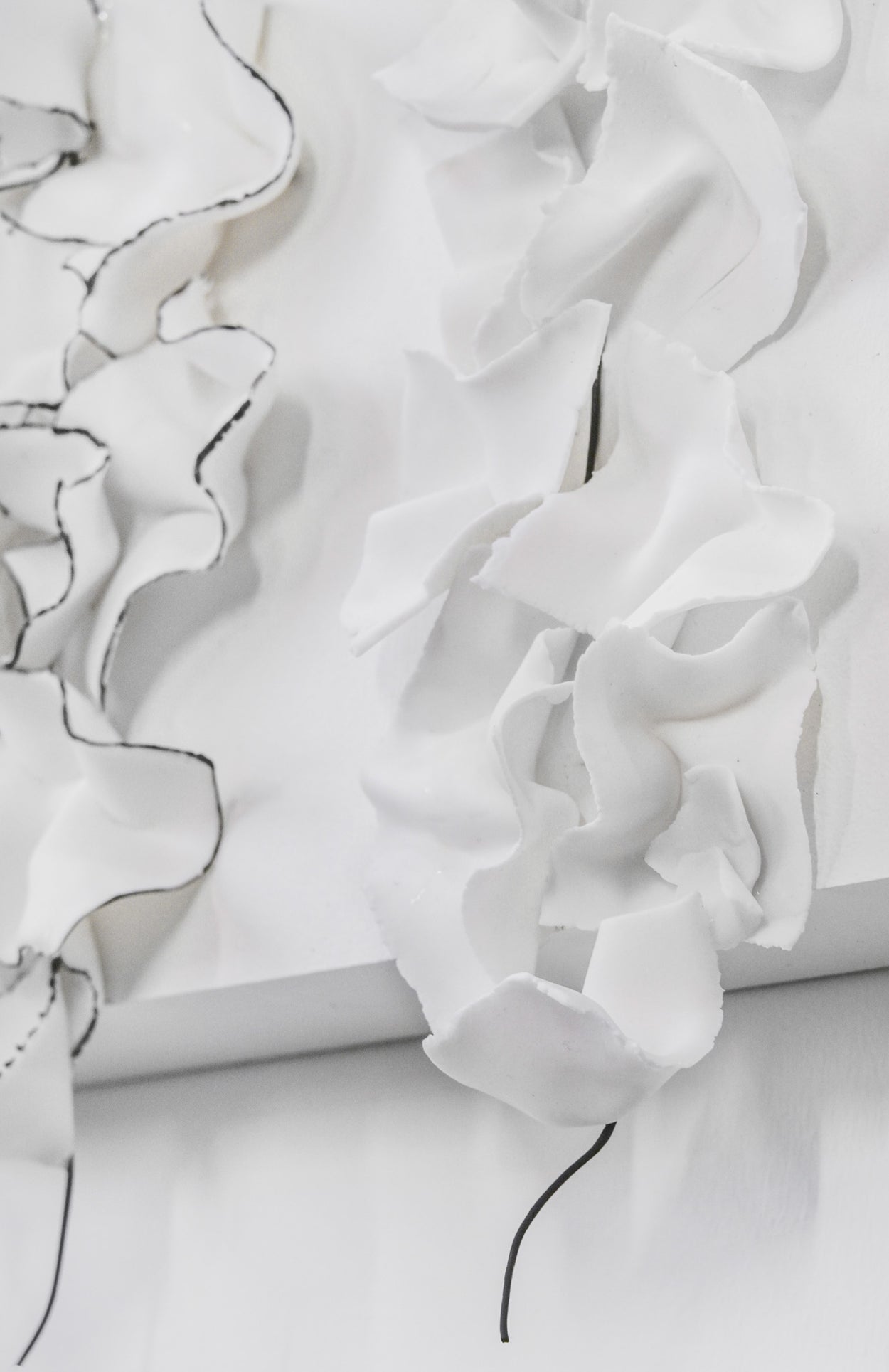 Les formes délicates et légèrement pliées de la porcelaine semblent prêtes à se détacher de leurs attaches, apportant un sentiment de légèreté, comme une danse fragile entre force et vulnérabilité. Le fil métallique, symbole de rigueur, structure cette composition tout en permettant à la porcelaine de s'en affranchir, illustrant ainsi une tension entre l'équilibre et la liberté.