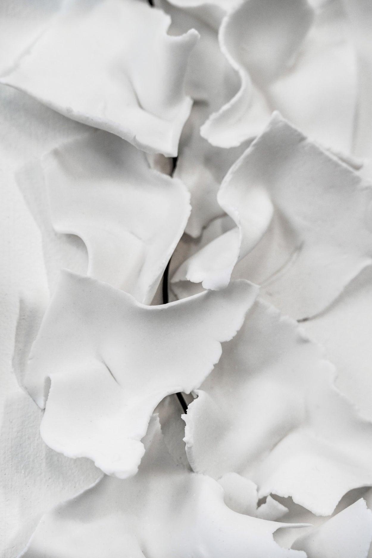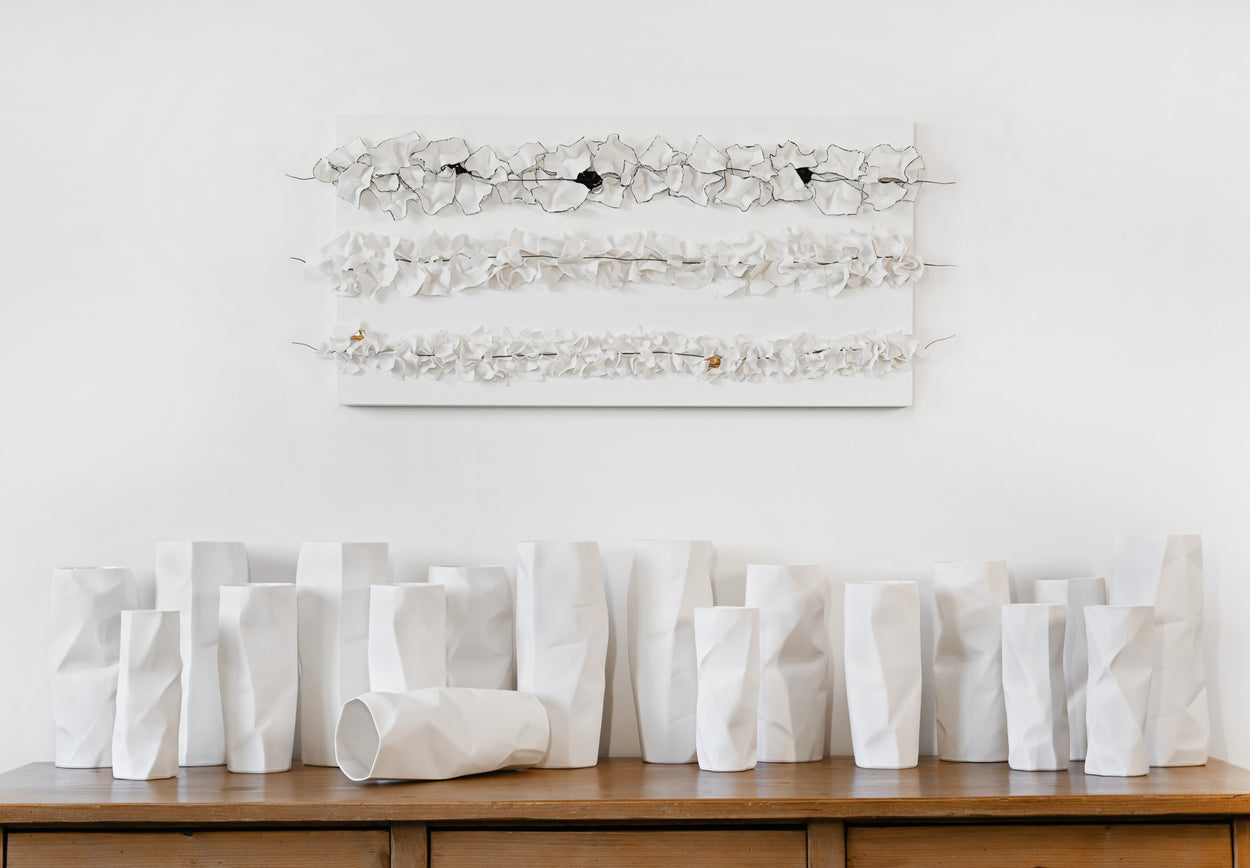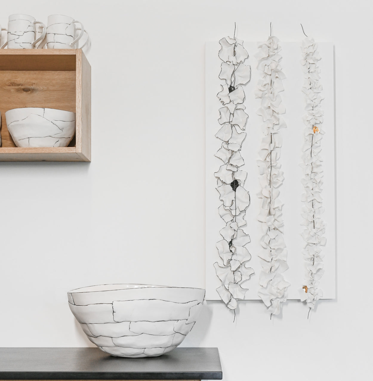 Les formes délicates et légèrement pliées de la porcelaine semblent prêtes à se détacher de leurs attaches, apportant un sentiment de légèreté, comme une danse fragile entre force et vulnérabilité. Le fil métallique, symbole de rigueur, structure cette composition tout en permettant à la porcelaine de s'en affranchir, illustrant ainsi une tension entre l'équilibre et la liberté.