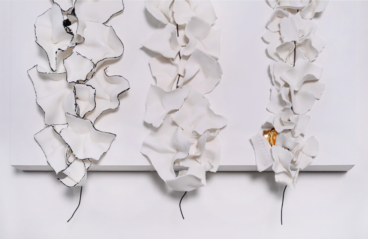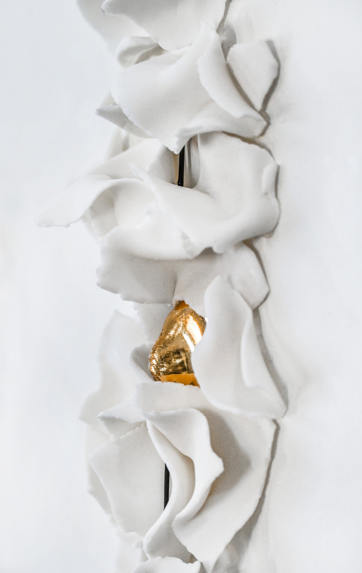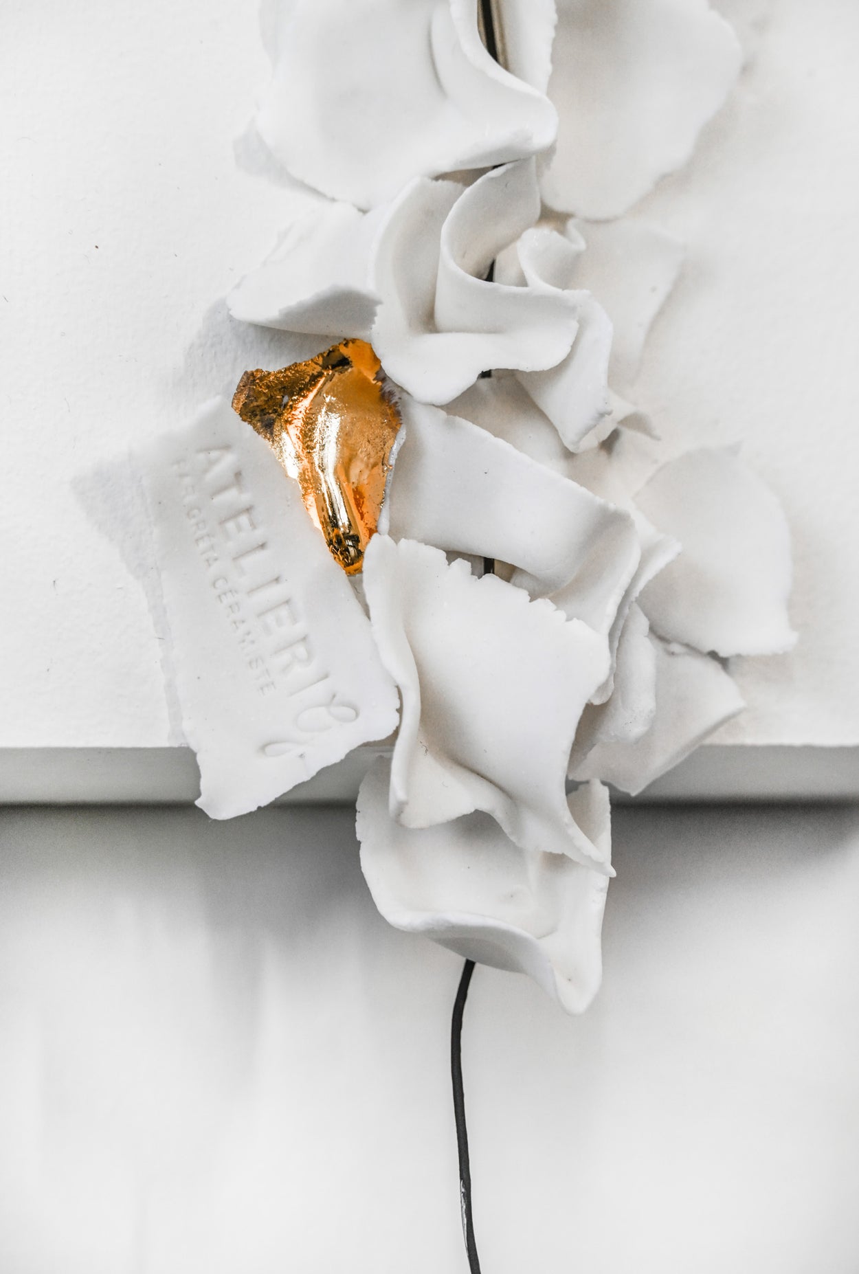 Bois, porcelaine blanche, fil métallique et ou 22k.