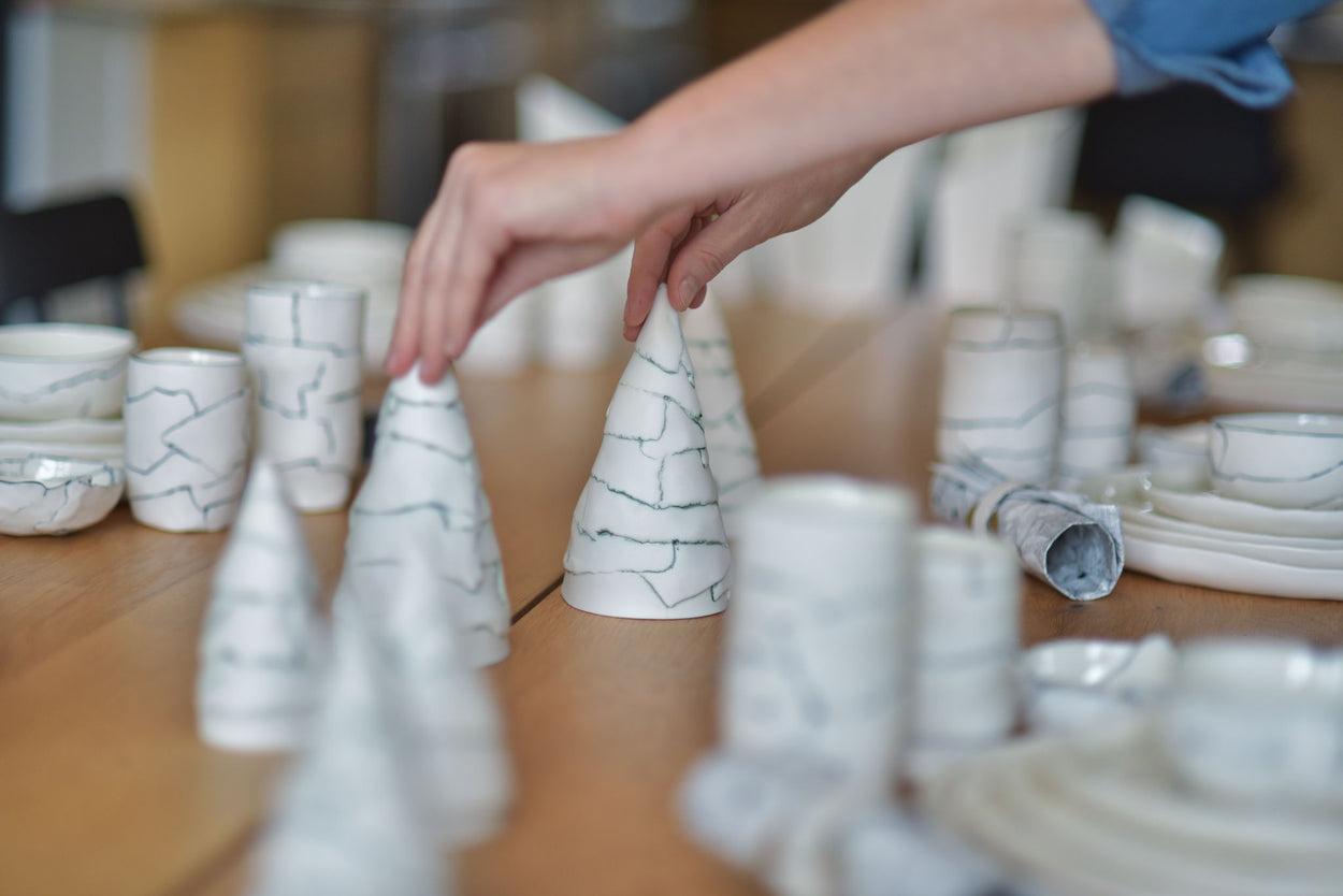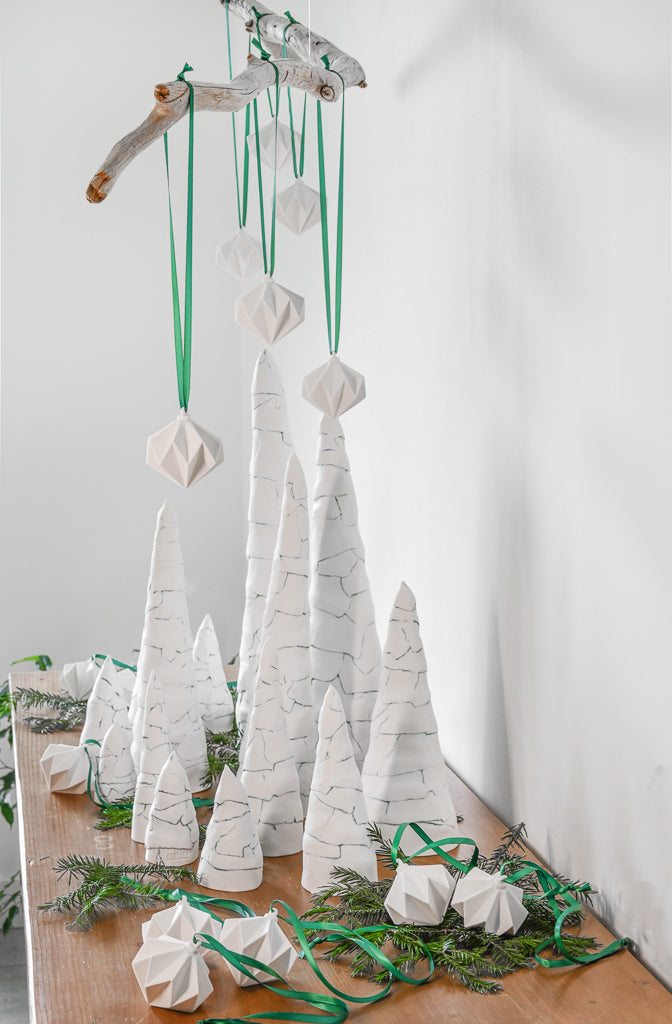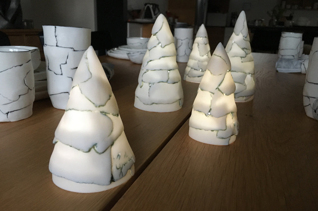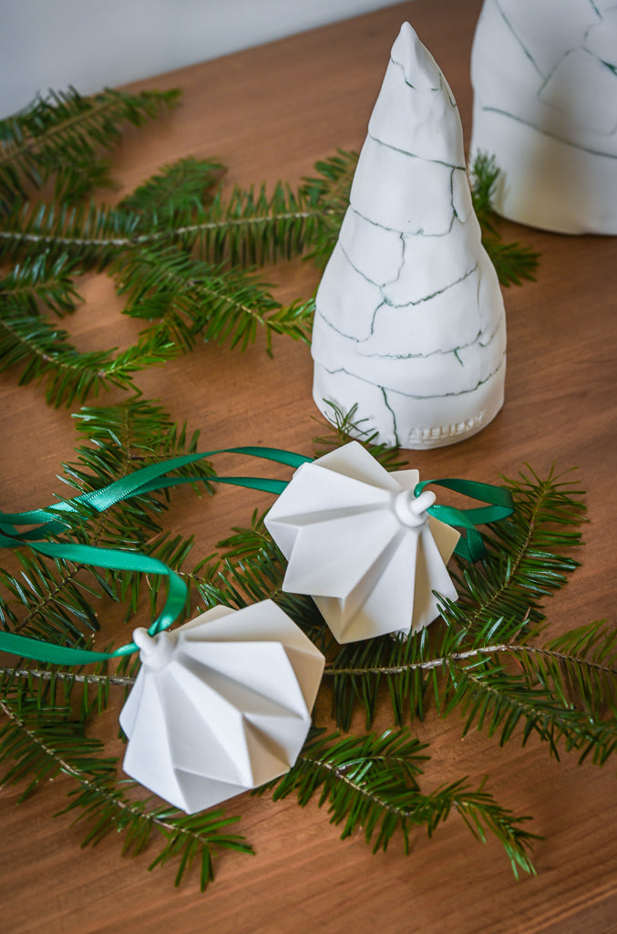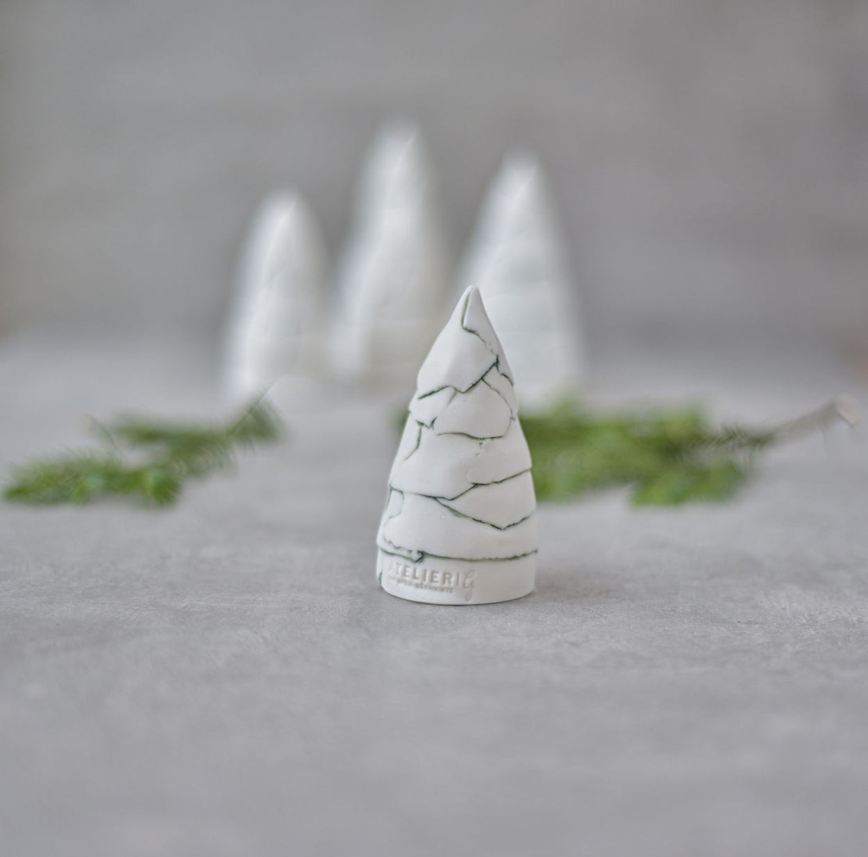 Façonnés à la main en porcelaine blanche, ces sapins évoquent la sérénité des forêts des Laurentides.