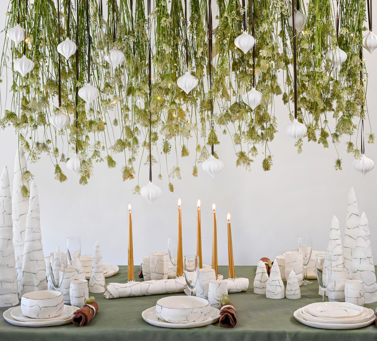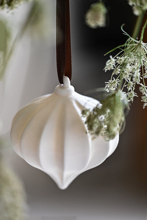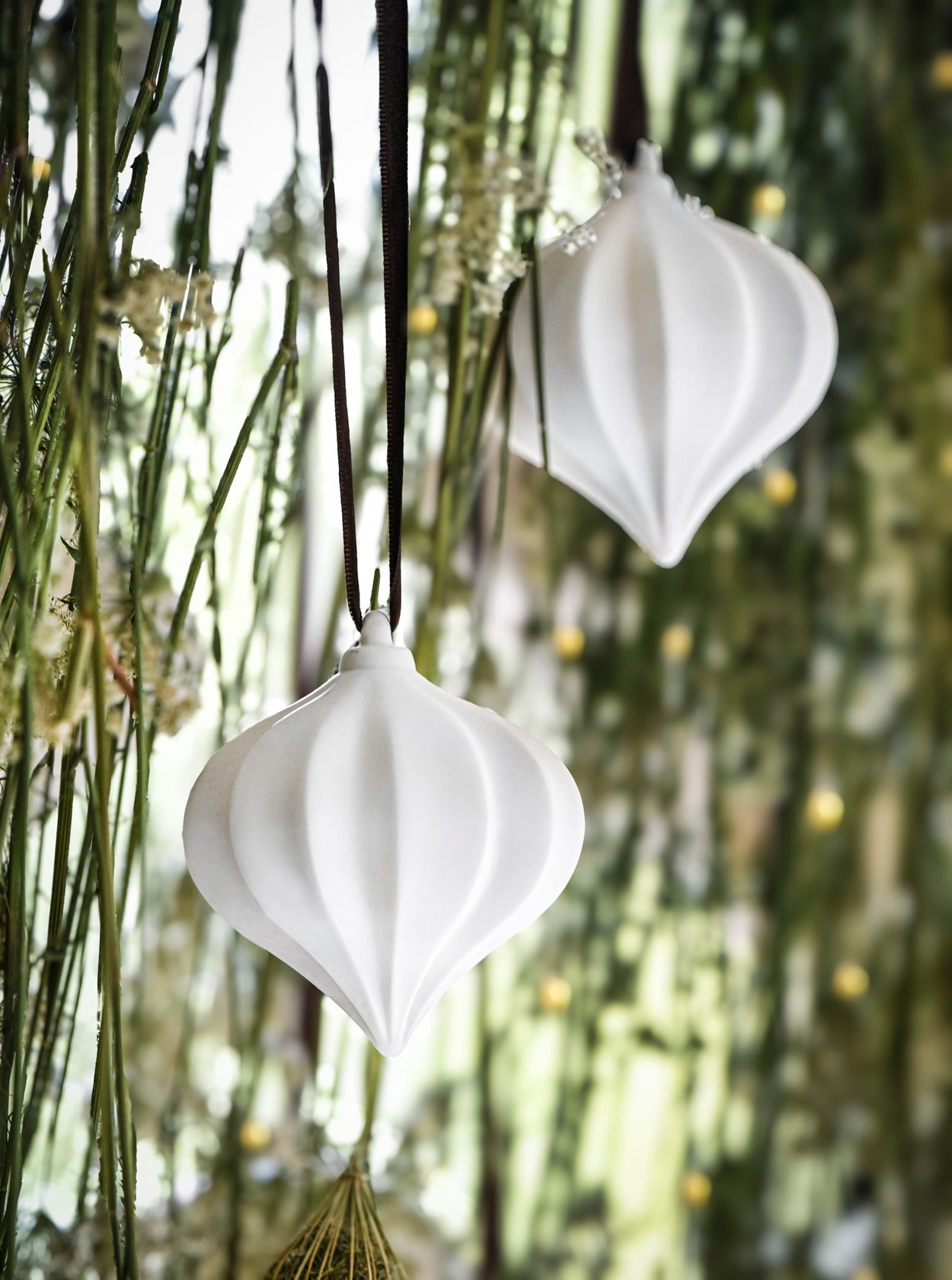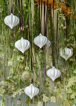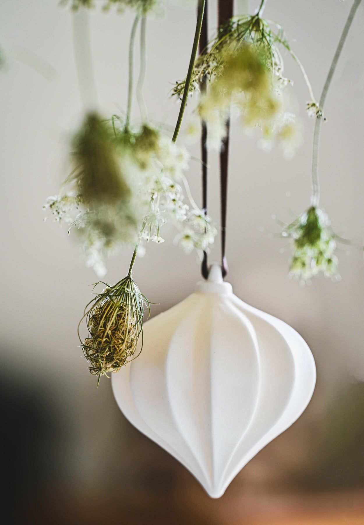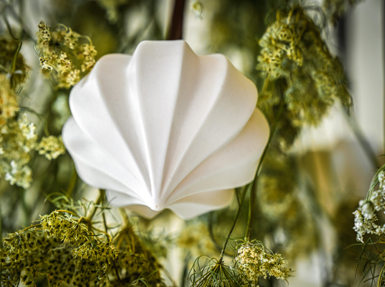 Cette année, à travers la feuille d'hosta, la boule de porcelaine se relie à la nature : sa blancheur douce dialogue avec les nervures végétales, dans un jeu de lumière et de matière.